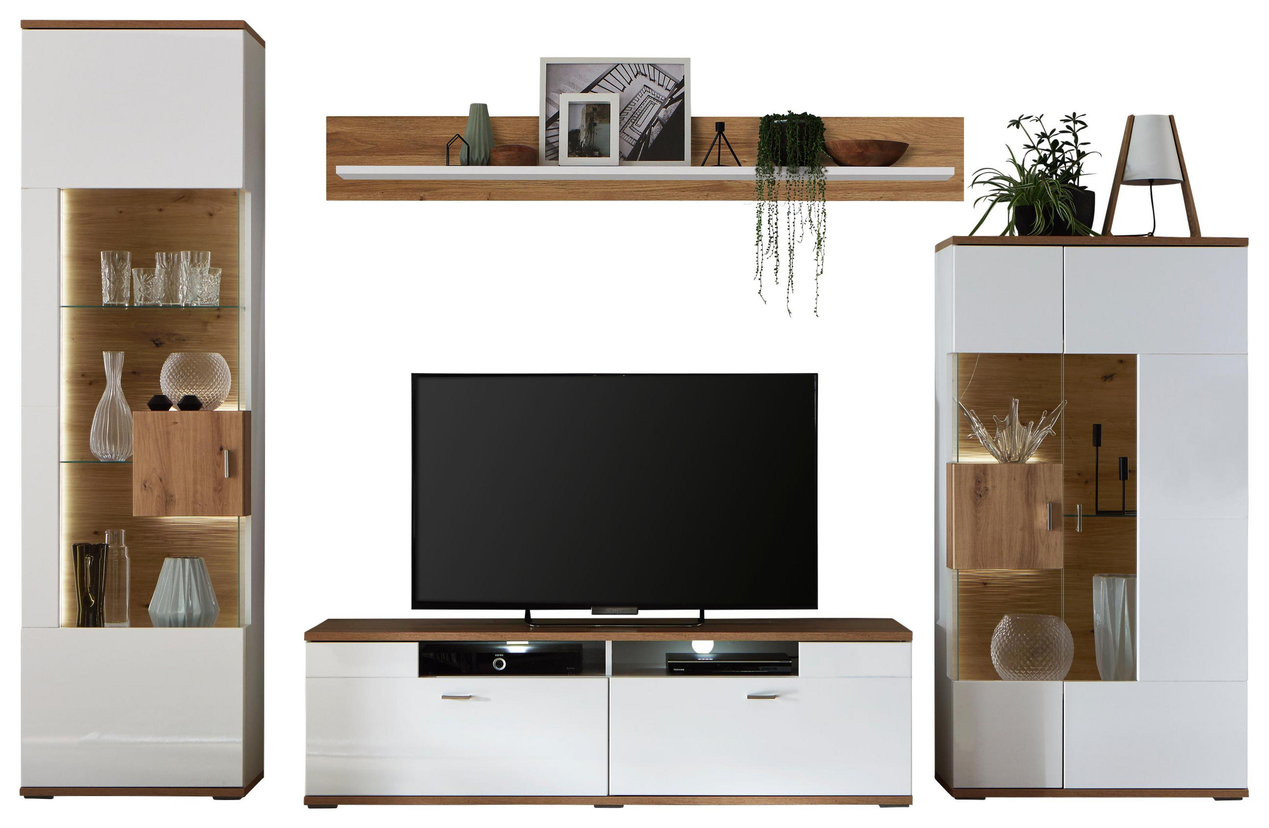 Wohnwand In Weiss Eichefarben Mit Sockelblende